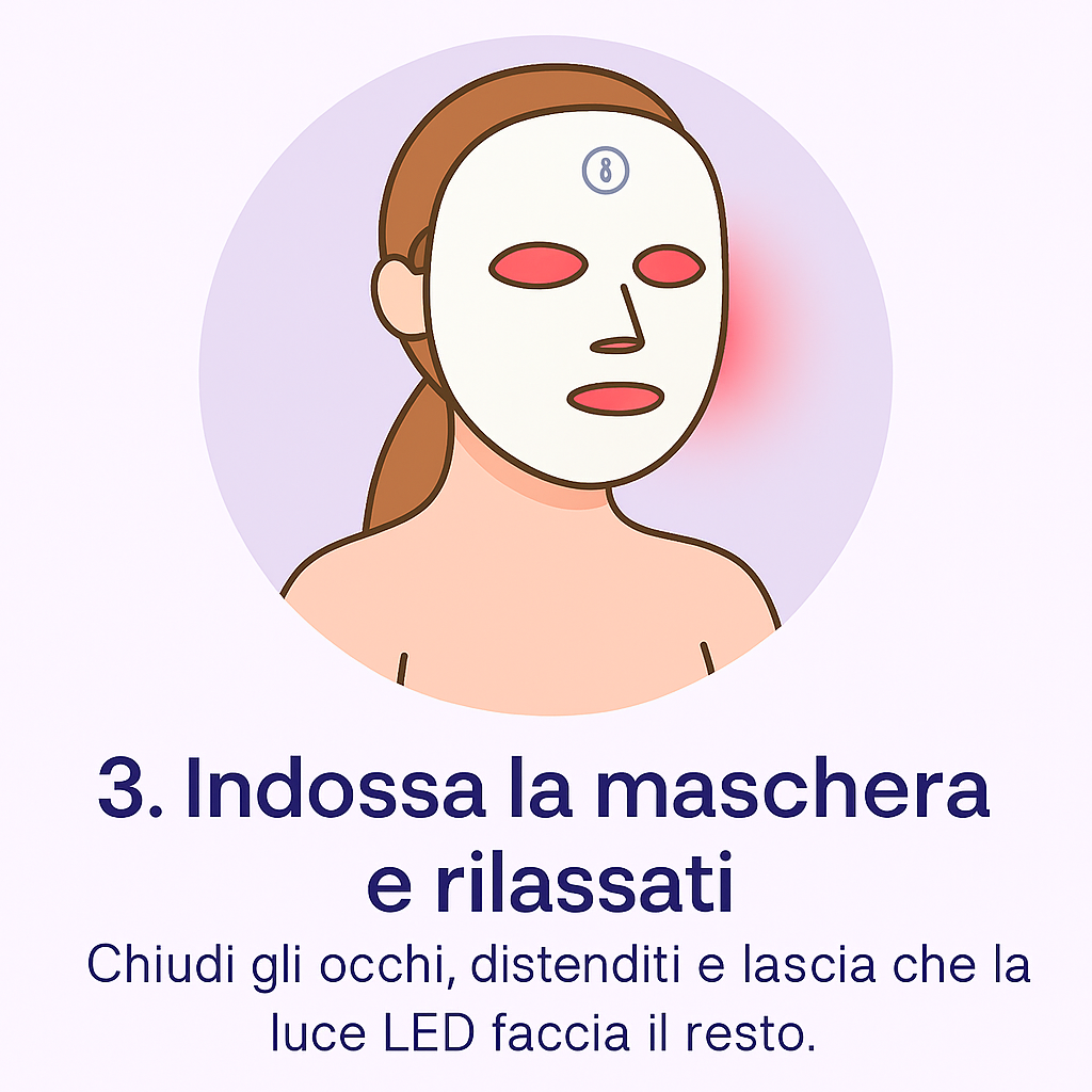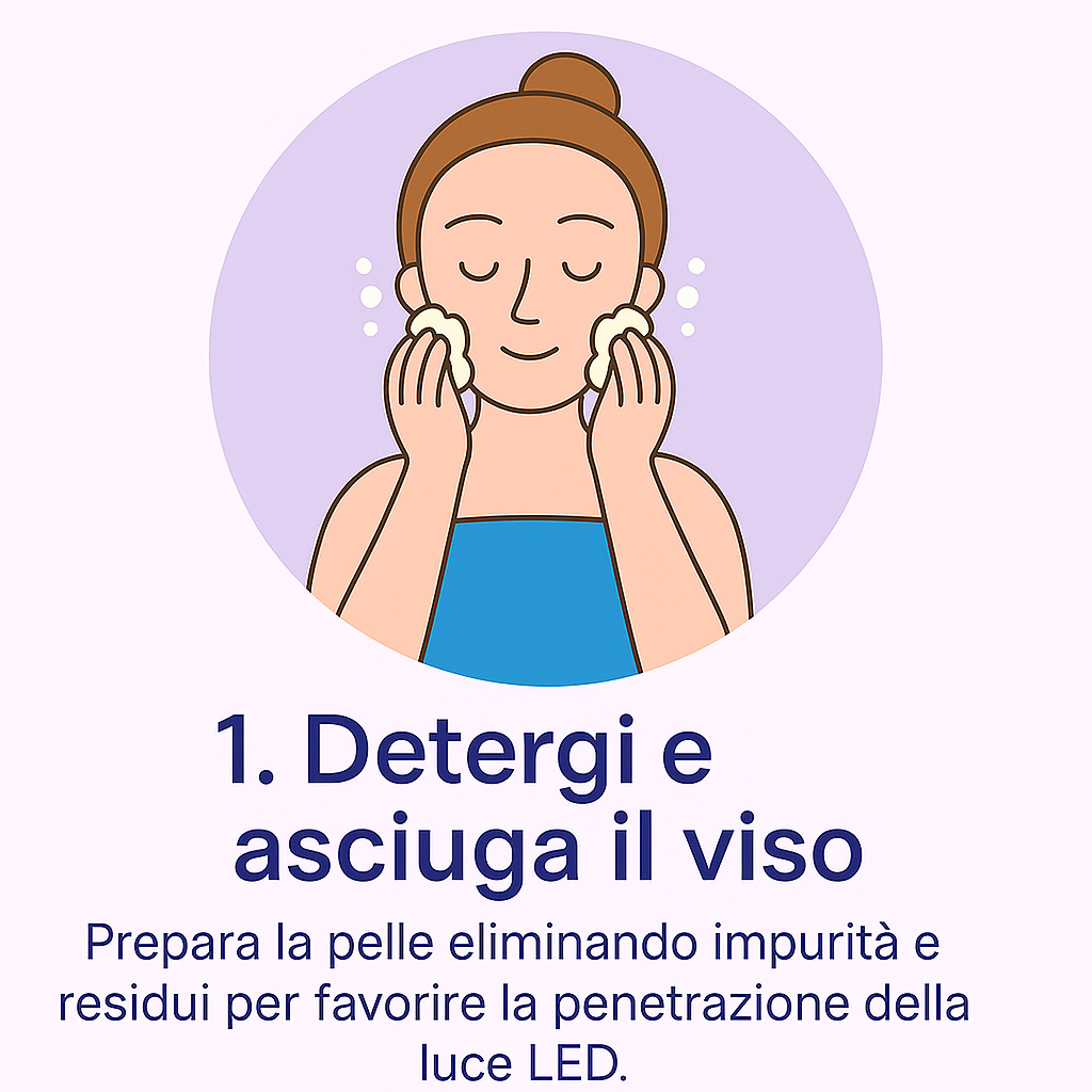 • Prima: detergere il viso con un cleanser delicato per eliminare impurità e permettere alla luce LED di penetrare meglio.